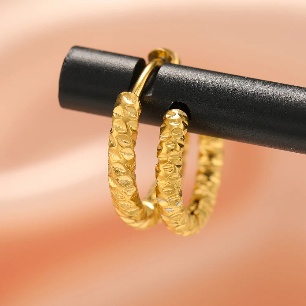 6pcs Stainless Steel Round Embossing Ear Rings PVD Gold Plated Korean Earrings Hoops Earring for Women Female Girls Metal Luxury